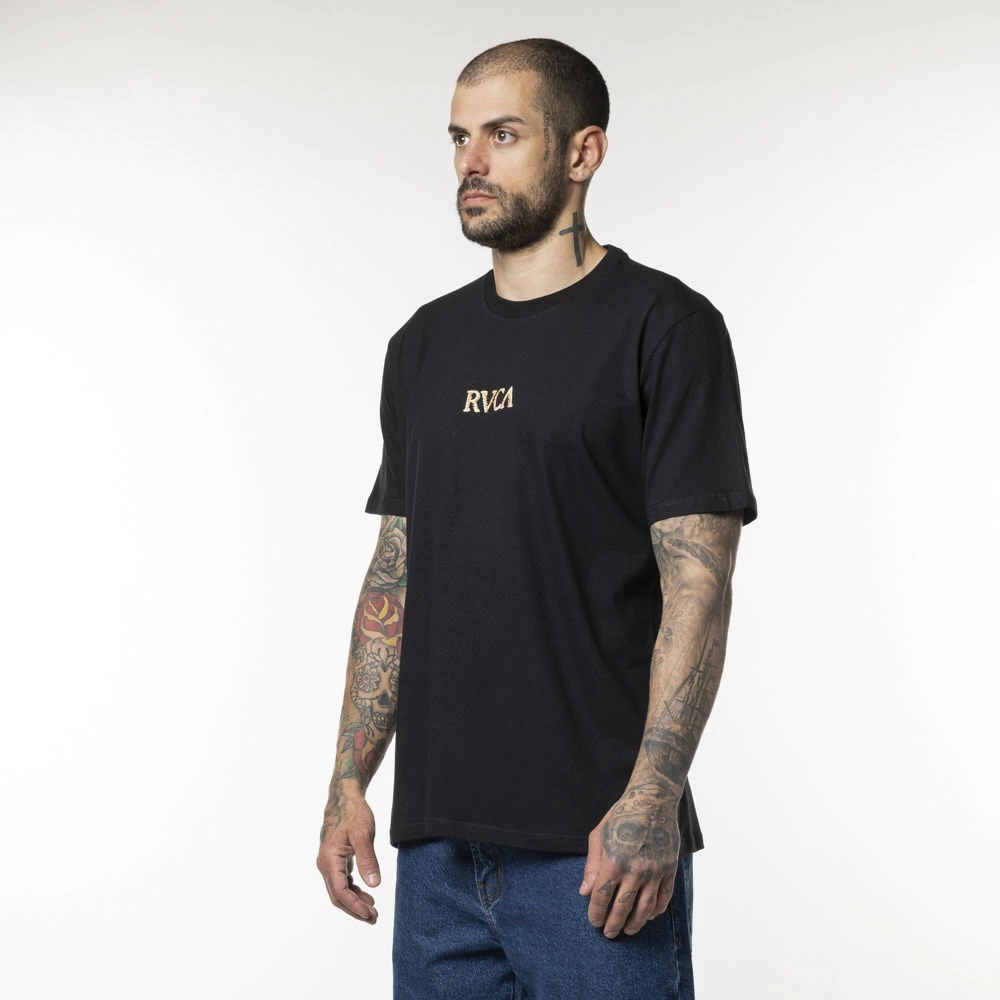 CAMISETA BÁSICA DE MALHA 30/1 PENTEADA, MODELAGEM REGULAR FIT (MAIS SOLTA AO CORPO PARA MAIOR LIBERDADE DOS MOVIMENTOS), COM ESTAMPA BIG RVCA CENTRALIZADA NA FRENTE, SILK INTERNO E TAG PERSONALIZADO.