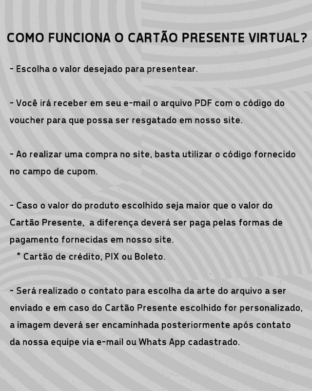- Será realizado o contato para escolha da arte do arquivo a ser enviado e em caso do Cartão Presente escolhido for personalizado, a imagem deverá ser encaminhada posteriormente após contato da nossa equipe via e-mail ou Whats App cadastrado.