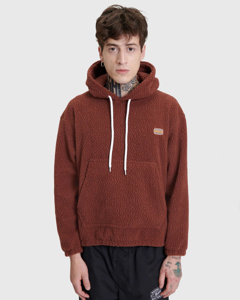 Blusa manga longa confeccionada em tecido sherpa. Possui capuz com cordão embutido para ajuste, bolso canguru, barra e punhos com elástico e aplicação de etiqueta emborrachada na parte frontal.