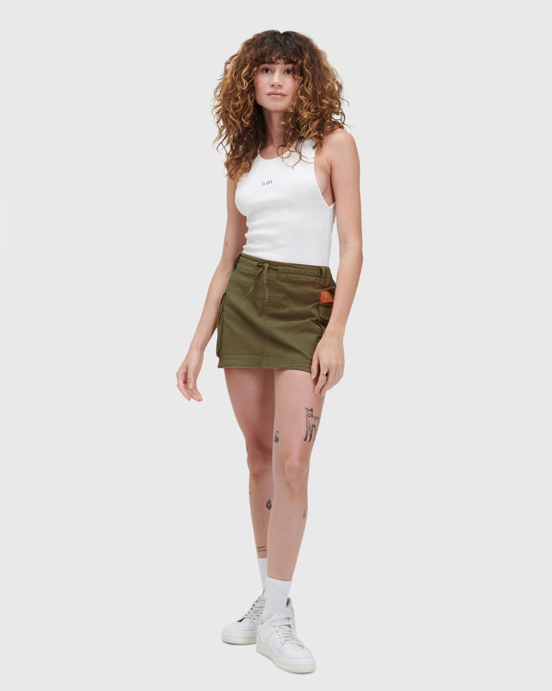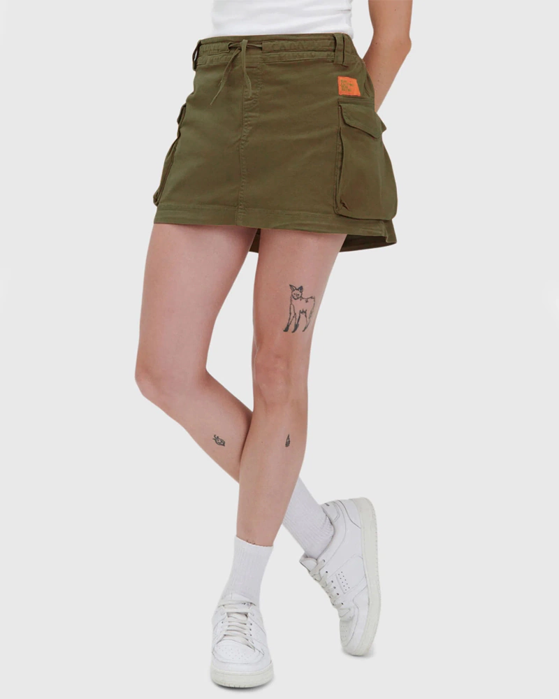 Saia modelagem cargo confeccionada em sarja. Possui bolsos laterais, etiqueta externa e cós com passantes, cordão embutido e elástico na parte traseira.
