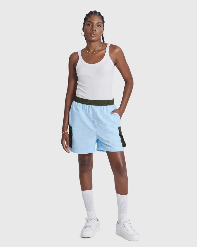 Shorts de poliamida c/ bolsos e cordão na cintura para ajuste.